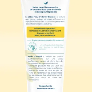 La Pâte à l’Eau Eryderm Biolane est spécialement formulée pour apaiser et protéger la peau fragile des bébés en cas d’irritations du siège. Grâce à sa formule enrichie en actifs protecteurs, elle soulage rapidement les rougeurs, répare l’épiderme et crée une barrière protectrice contre l’humidité et les frottements liés aux couches. Sa texture douce s’applique facilement et laisse un film protecteur qui aide à prévenir les irritations. Composée à 95 % d’ingrédients d’origine naturelle, elle est testée cliniquement pour garantir sécurité et efficacité dès la naissance.
