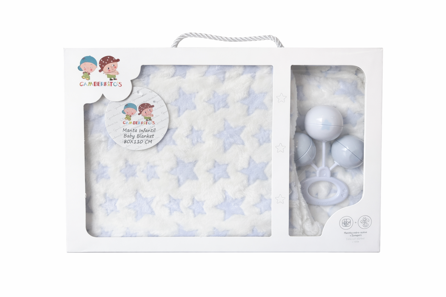 Offrez douceur et tendresse avec ce joli coffret cadeau pour bébé de la marque Gamberritos. Présenté dans une élégante boîte, ce set comprend une couverture bébé ultra douce décorée d’étoiles et un hochet assorti, parfait pour éveiller les sens de bébé.