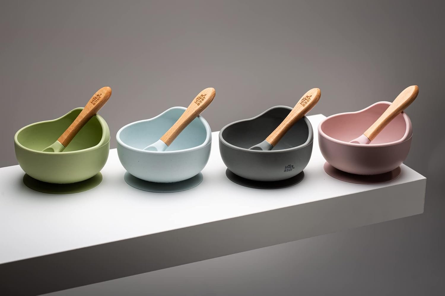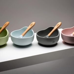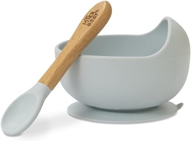 - Ensemble composé d’une cuillère et d’un bol en silicone avec une ventouse pour fixer fermement à la surface.
