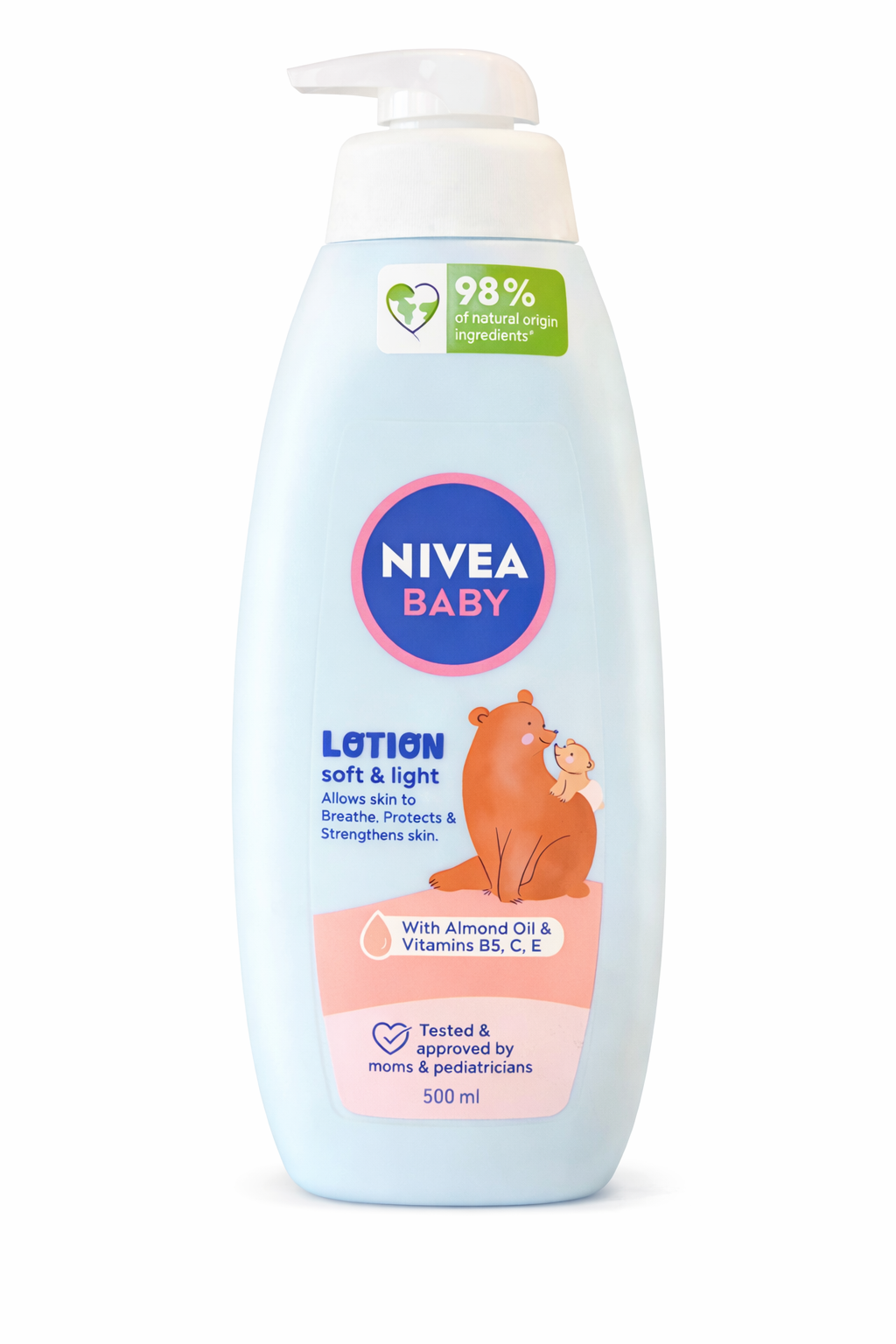 La lotion NIVEA Baby Soft & Light hydrate délicatement la peau de bébé tout en la laissant respirer naturellement. Sa texture légère pénètre rapidement sans effet gras, offrant une hydratation longue durée pour une peau douce et confortable au quotidien.