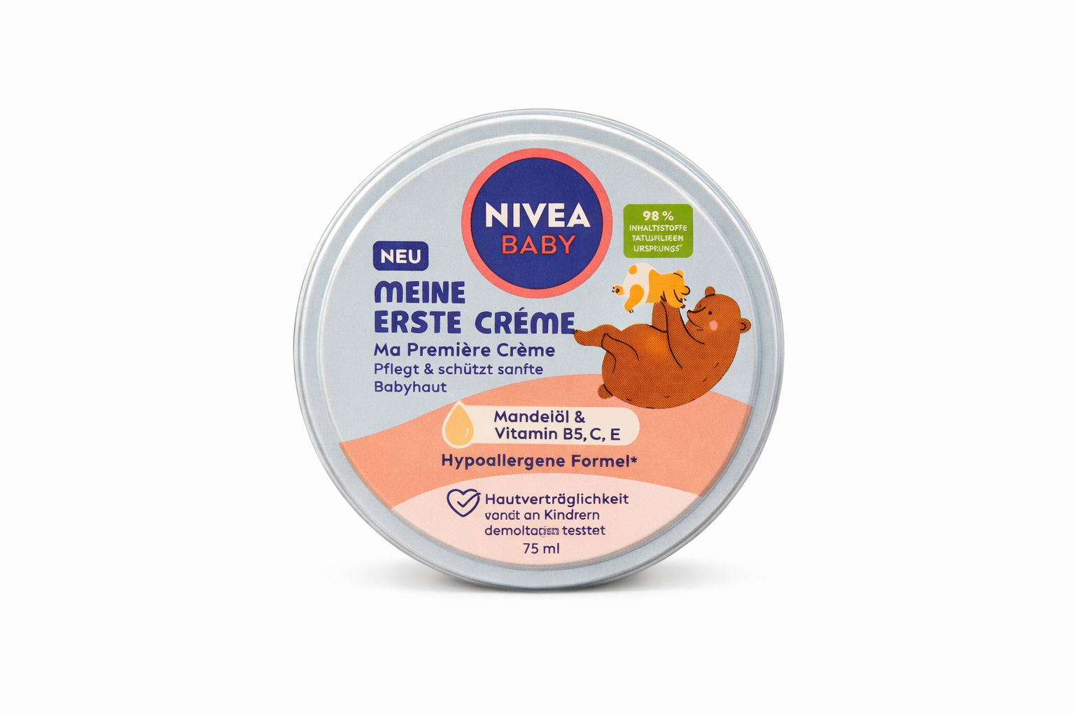 La NIVEA Baby Ma Première Crème est spécialement formulée pour prendre soin de la peau délicate des bébés dès les premiers jours. Enrichie en huile d’amande douce et vitamines B5, C et E, elle nourrit, hydrate et protège la peau sensible de bébé contre le dessèchement. Sa formule hypoallergénique respecte l’équilibre naturel de la peau et aide à la garder douce, souple et confortable. Idéale pour le visage et le corps, elle est adaptée à une utilisation quotidienne.